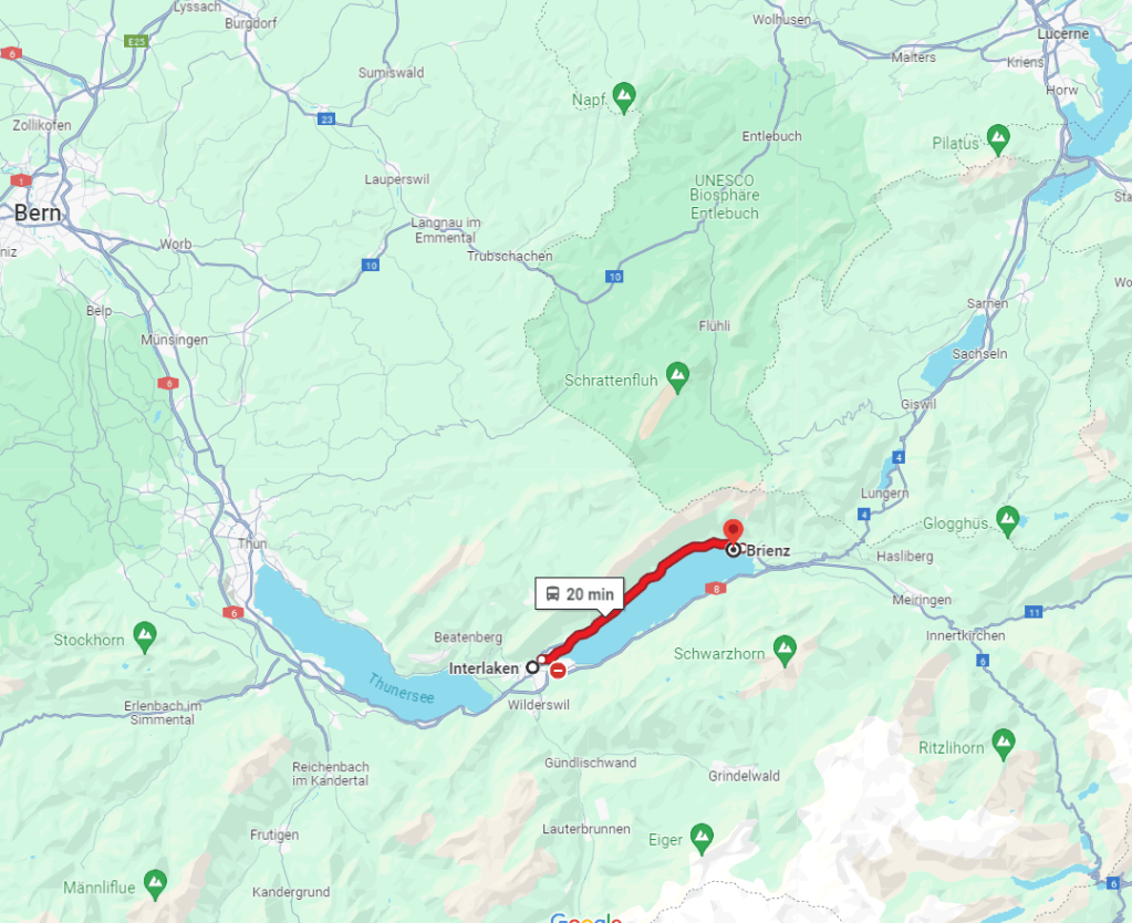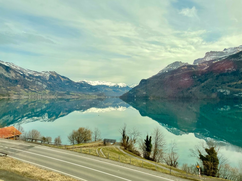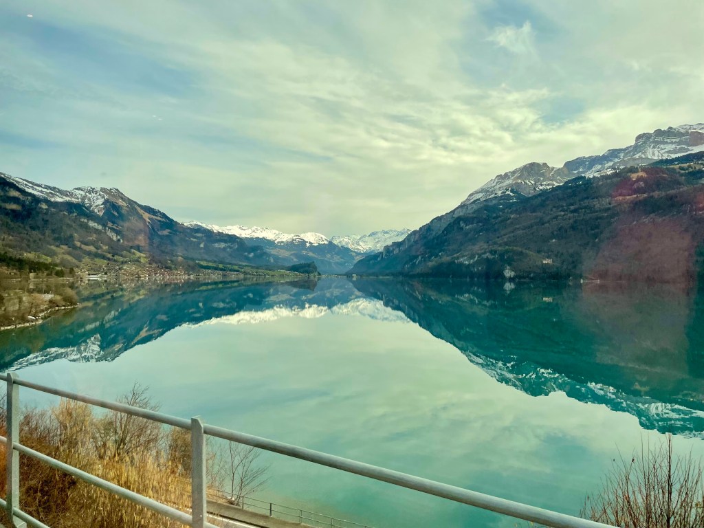 Lucerne–Interlaken Express panoramic train face 20 de minute de la Interlaken la Brienz şi circulă din 30 în 30 de minute, toată ziua. Se cheamă panoramic pentru că vagoanele sunt foarte înalte iar ferestrele sunt până sus şi chiar un pic deasupra, pe tavan, totul făcut pentru a-ţi da şansa să admiri peisajele de poveste ale Alpilor Bernezi care se reflectă perfect în apa turcoaz a lacului Brienz. Să vezi e cu totul altă experienţă, iar o poză făcută cu telefonul mobil prin geamul trenului este departe de a face dreptate peisajului alpin. Dar, ca să vă faceţi o vagă idee, cam asta am admirat eu acum câteva ore: